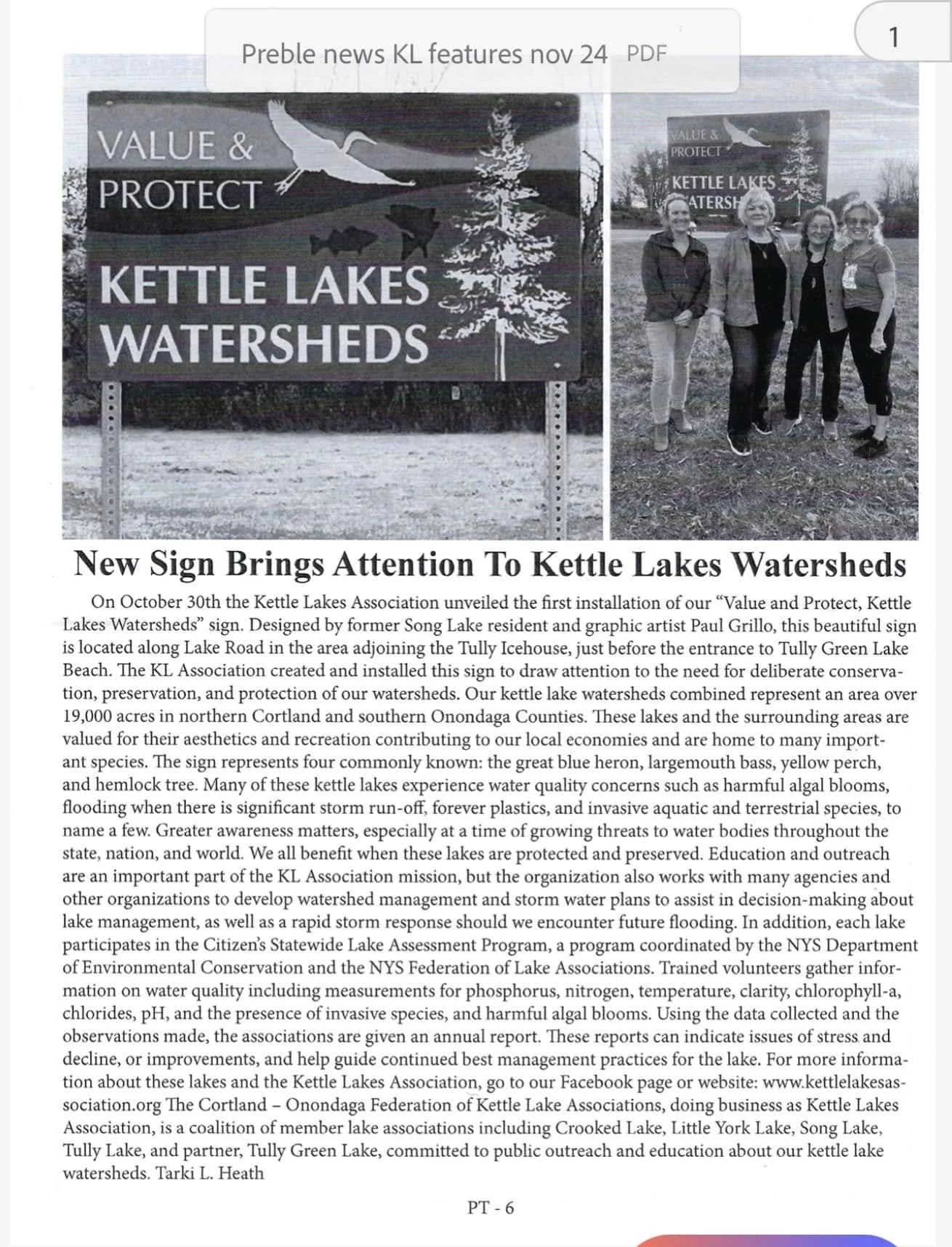 CNY KETTLE LAKES ASSOCIATION DRAWS ATTENTION TO THE NEED FOR PRESERVATION AND PROTECTION OF OUR WATERSHEDS
