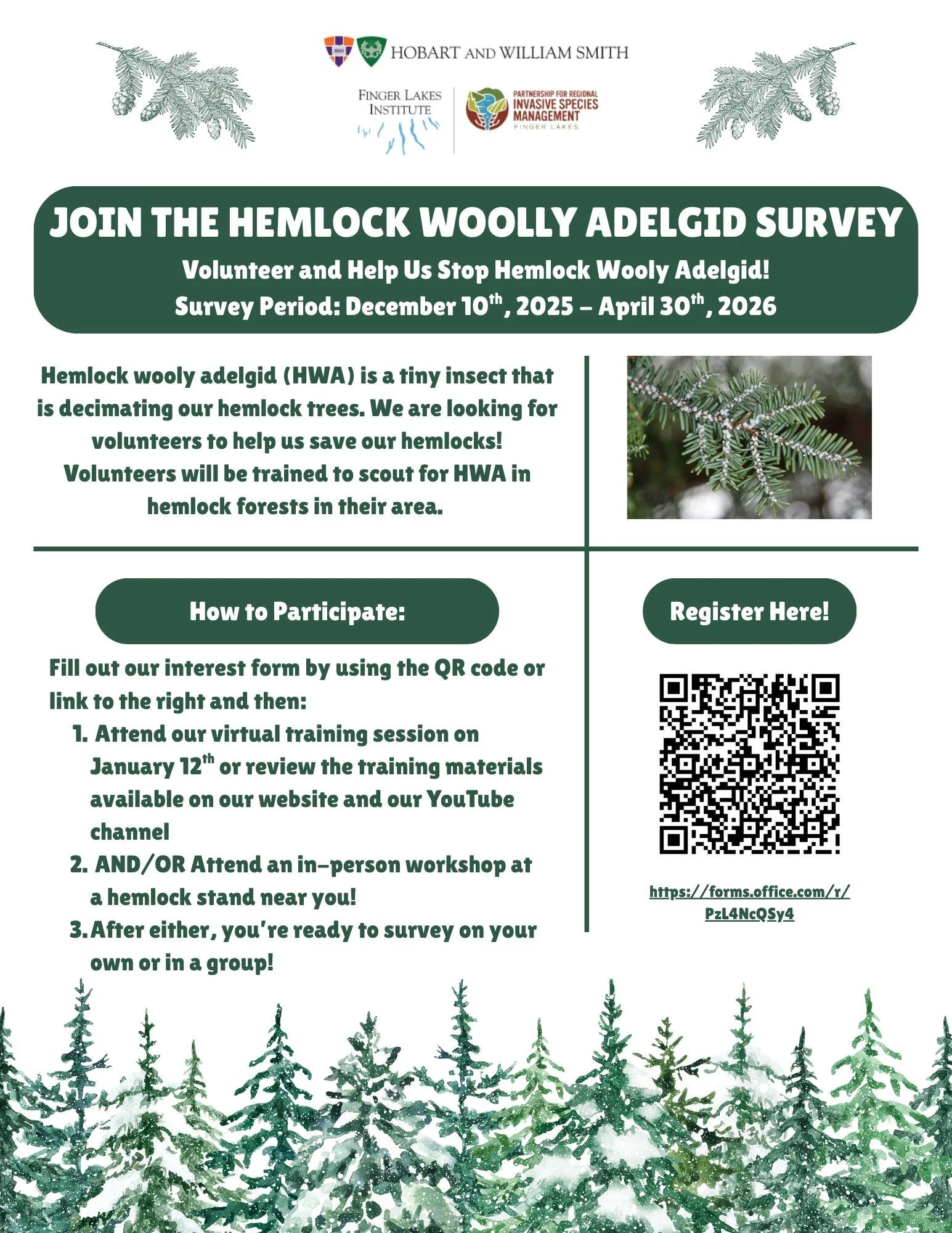 Kettle Lakes Association is partnering with Otisco Lake Preservation Association, Finger Lakes Institute, Hobart William and Smith, and Partnership for Regional Invasive Species Management to offer a FREE workshop aimed at identifying and reporting Hemlock Wooly Adelgid with is threatening these majestic trees. Please join us.