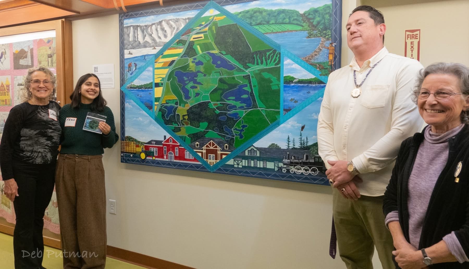 Muralist Brandon Lazore, Onondaga Snipe Clan, with Rewa Phansalkar- Research and Outreach Specialist, New York Water Resources Institute-Cornell University, Tarki Heath- Kettle Lakes Association President and Colleen Zawadzki- Kettle Lakes Association Vice President.